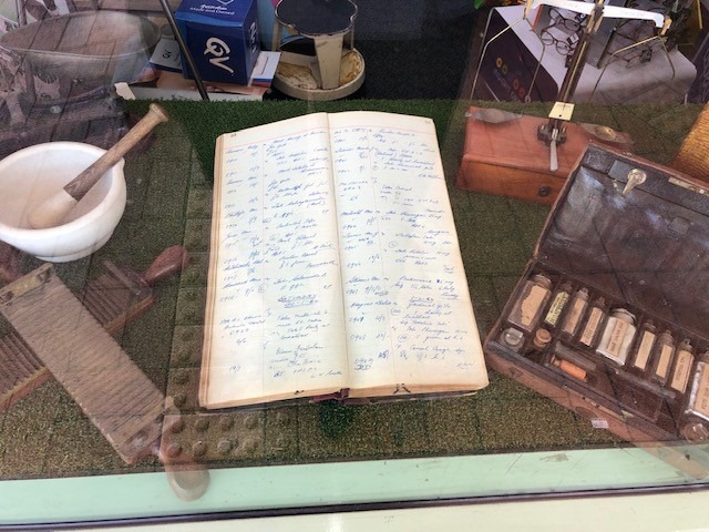 The Knynenburgs have created a window display to celebrate their 25 years in business, featuring old prescription books and pill rollers on loan from PSA.