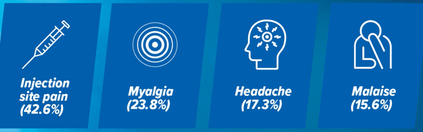 Most common reactions after Fluzone High-Dose Quadrivalent administration. The safety was assessed in a pooled analysis of two clinical trials in 2,549 adults aged 60+.19
