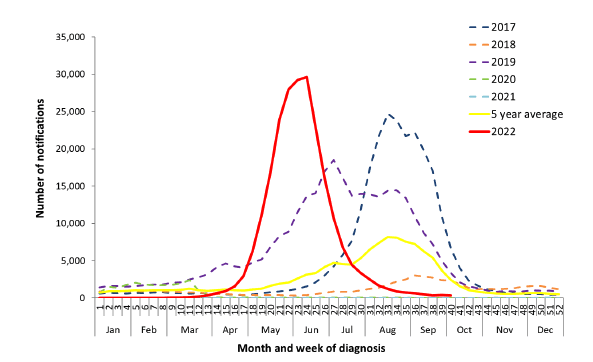 - Australian Government Department of Health and Aged Care. Australian Influenza Surveillance Report No. 14, 2022. Reporting fortnight: 26 September to 09 October 2022.