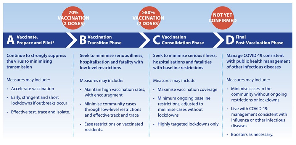 ‘The National Plan to Transition Australia’s National COVID-19 Response2 outlines the Government’s policy framework for safely reopening, consistent with health advice.’ The 4-phase plan, released as NSW entered what would be a 15-week lockdown with a daily high of 1,599 infections – eclipsed by Victoria’s more than 2,297 weeks later – involves transitioning phases A and B (see Table 1) and stepping through phases C and D to at least 80% of the national population vaccinated and living a new normal with the virus in the community, like influenza, which is not far away