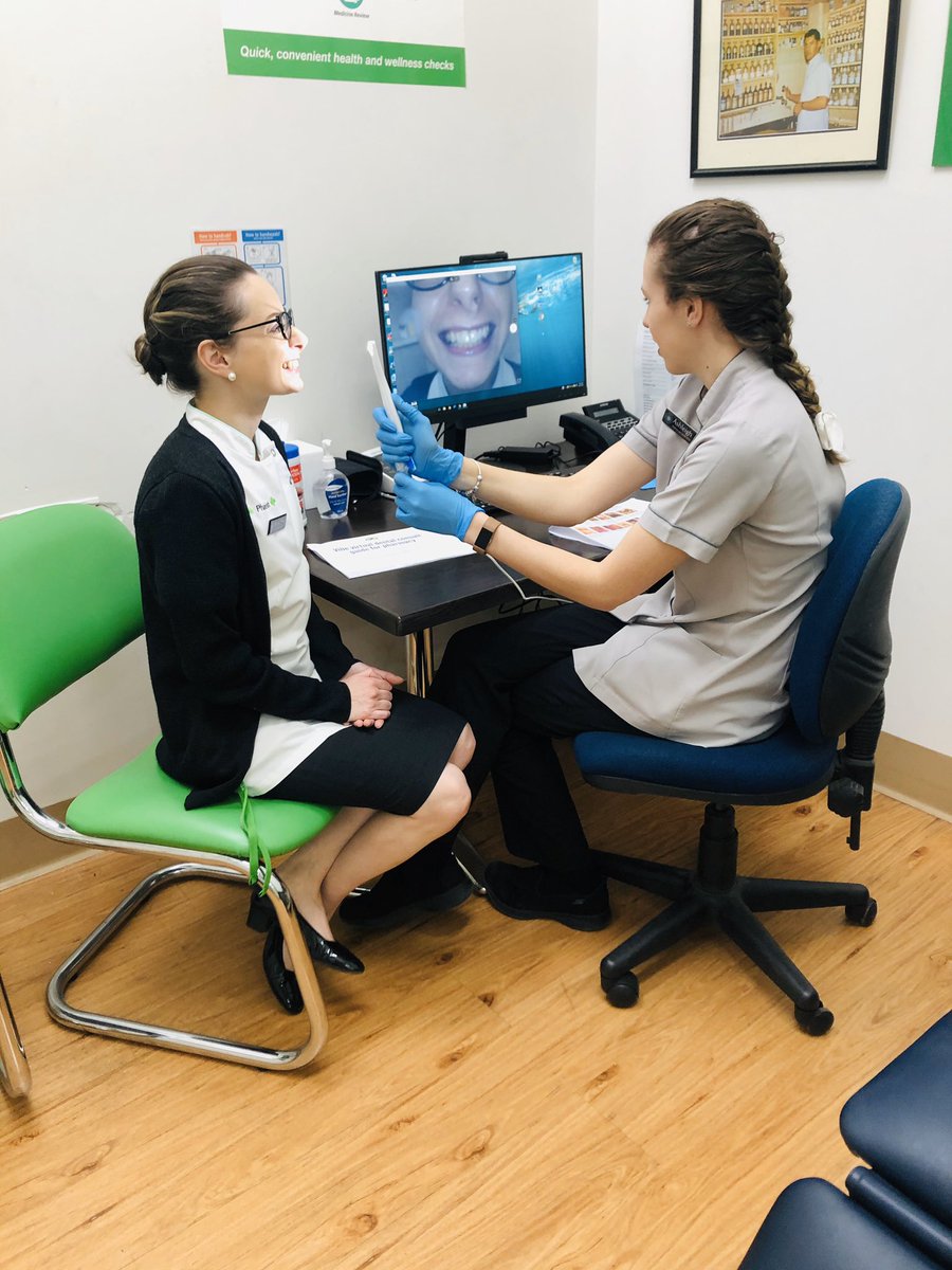 In the pharmacy consultation room a pharmacy assistant, specially trained in the technology, uses an intra-oral camera to take images or a video of the patient’s teeth and mouth.
