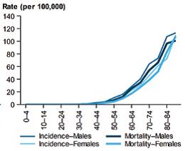Figure 1. (i) The age-standardised incidence and mortality rate of pancreatic cancer, by sex, since 1982 and (ii) Incidence (2013) and mortality (2014) rates of pancreatic cancer, by age group and sex.3