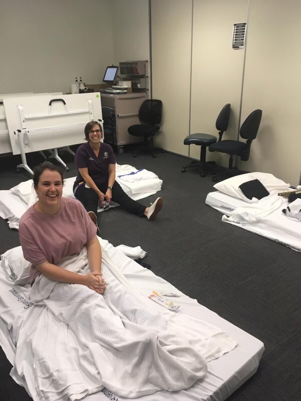 The team spent the night sleeping on gym mats in the pharmacy department in surgical scrubs, after attending a dinner with hospital staff.
