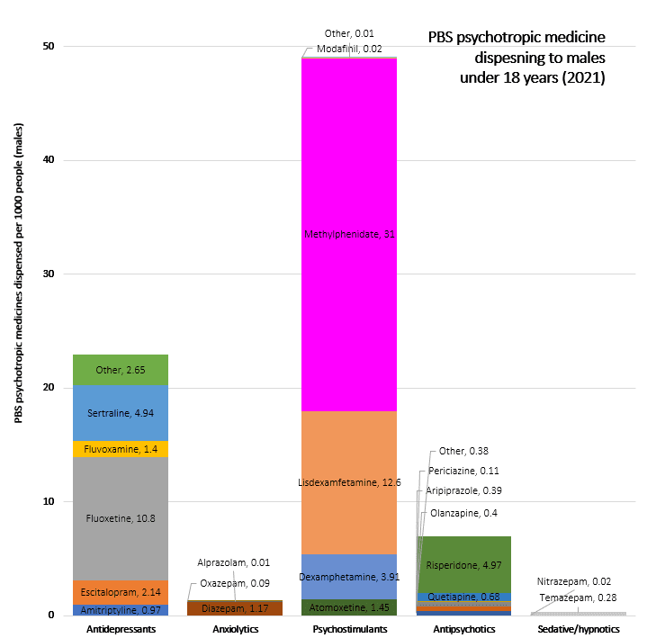 Analysis of a 10% random sample of Pharmaceutical Benefits Scheme dispensing data found dispensing of antidepressant, anxiolytic, antipsychotic, psychostimulant, and sedative medicines to children and adolescents was 3.4 per 100 boys and 2.5 per 100 girls in 2013, and 6.0 per 100 boys and 4.8 per 100 girls in 2021.
