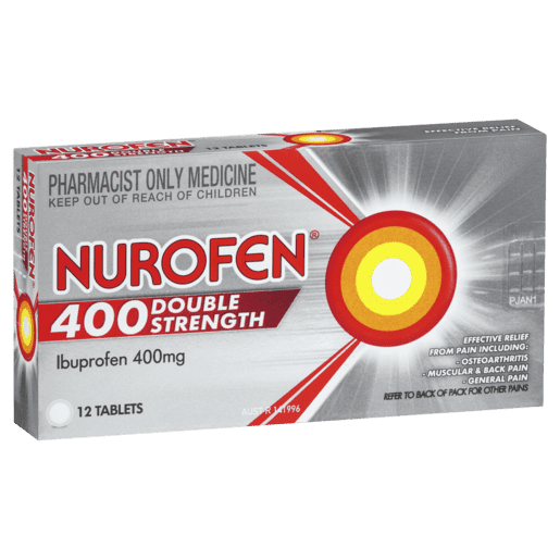 Nurofen Double Strength contains 400 mg ibuprofen. For the temporary relief of pain and/or inflammation. Ask your pharmacist – they must decide if this product is right for you. This medicine may not be right for you. Read the label before purchase. Follow the directions of use. Incorrect use could be harmful. If symptoms persist, talk to your health professional.