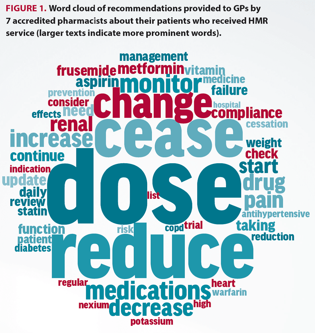 The most common DRPs were associated with drug selection (26.7%), over/under prescription (20.0%), untreated indications (13.9%) and compliance/concordance (12.0%). The top three recommendations written by APs were qualitatively analysed to determine the key words used within the recommendations (Figure 1). The key words ‘dose’, ‘reduce’, ‘cease’ and ‘change’ are predominately associated with recommendations for dose reduction and deprescribing.