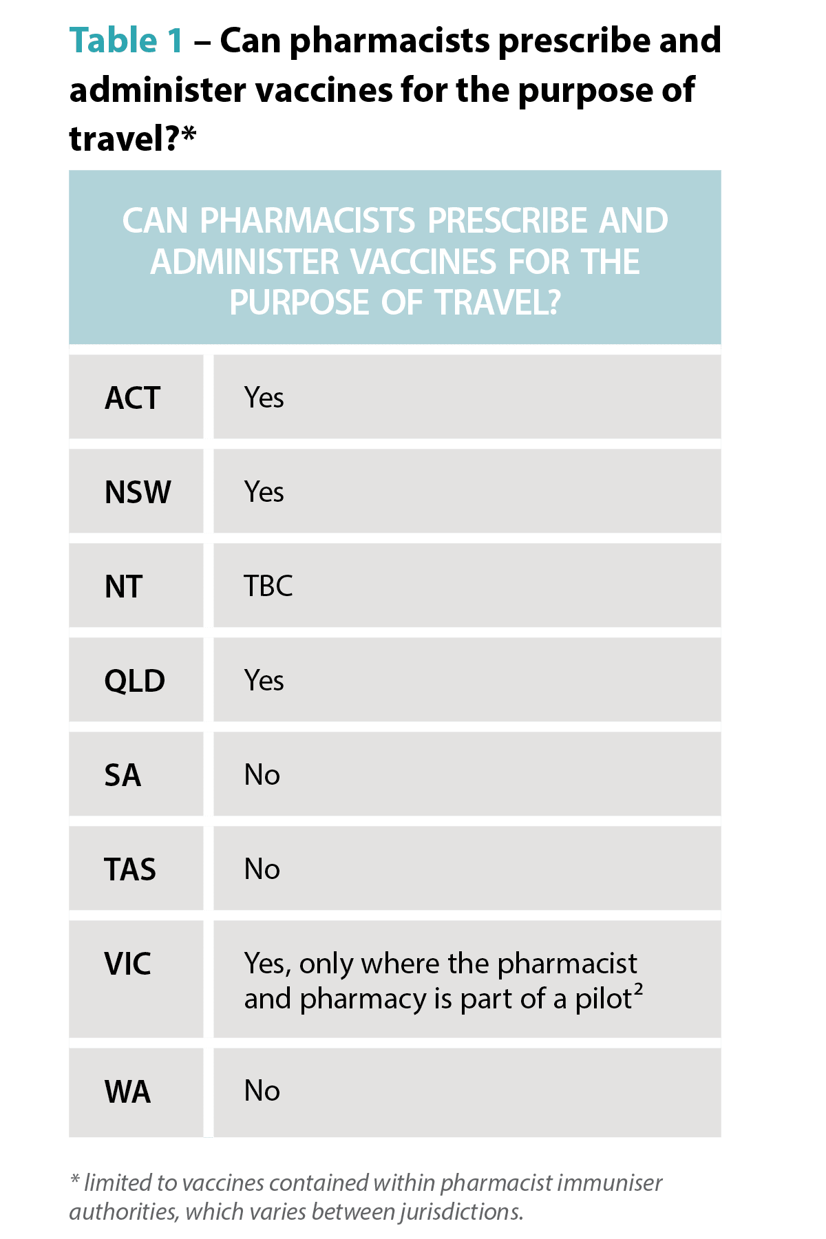 ‘Outside of a formalised program like the Victorian Community Pharmacy Statewide Pilot project,2 the pharmacist may not go into as much depth about [travel health] matters because there’s an expectation the consumer’s GP will have that discussion when a patient asks about vaccines,’ says PSA Victorian State Manager Jarrod McMaugh MPS.